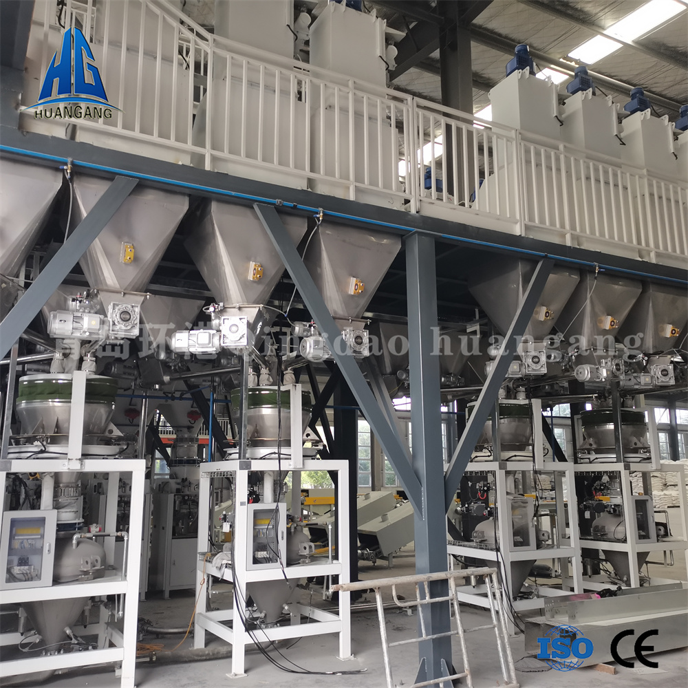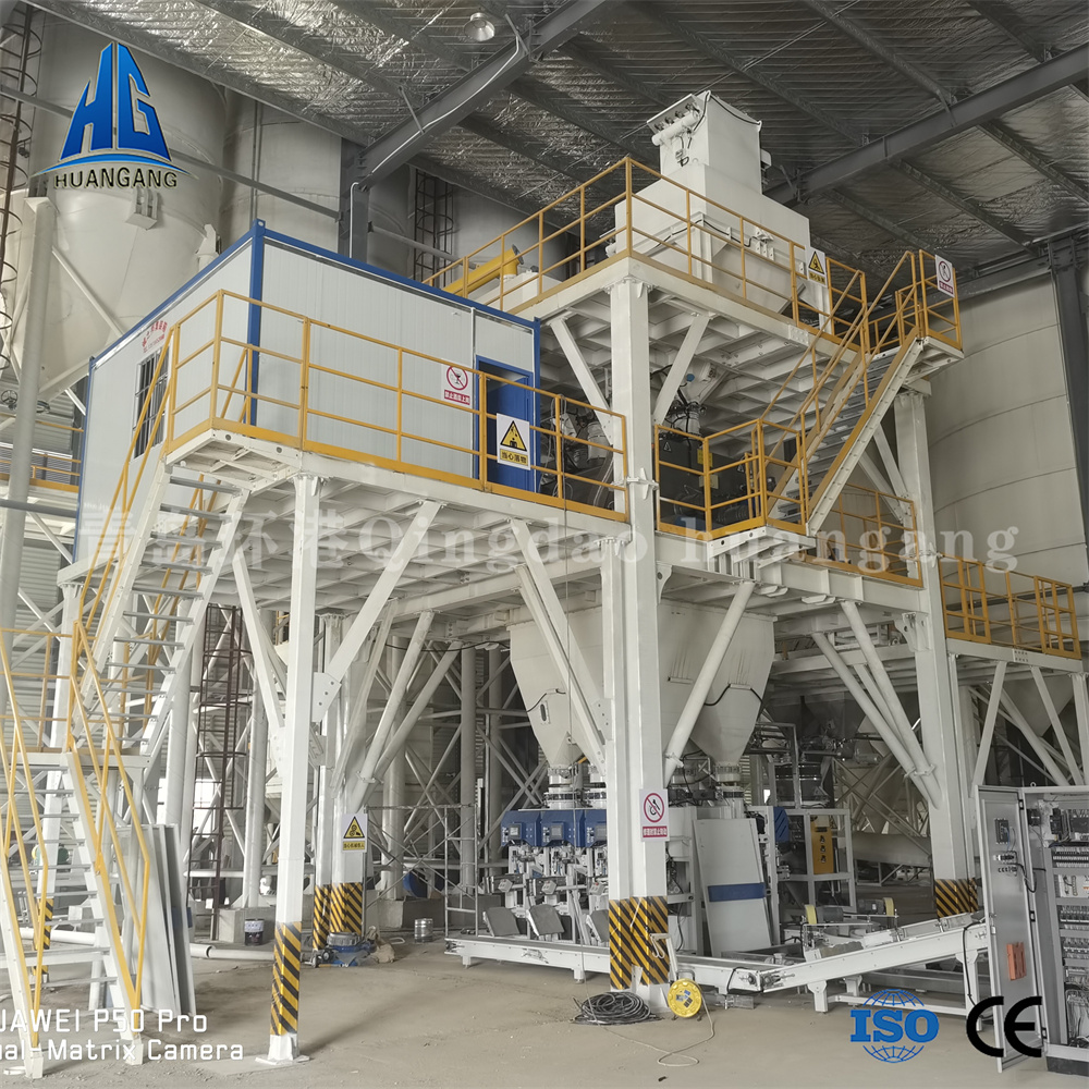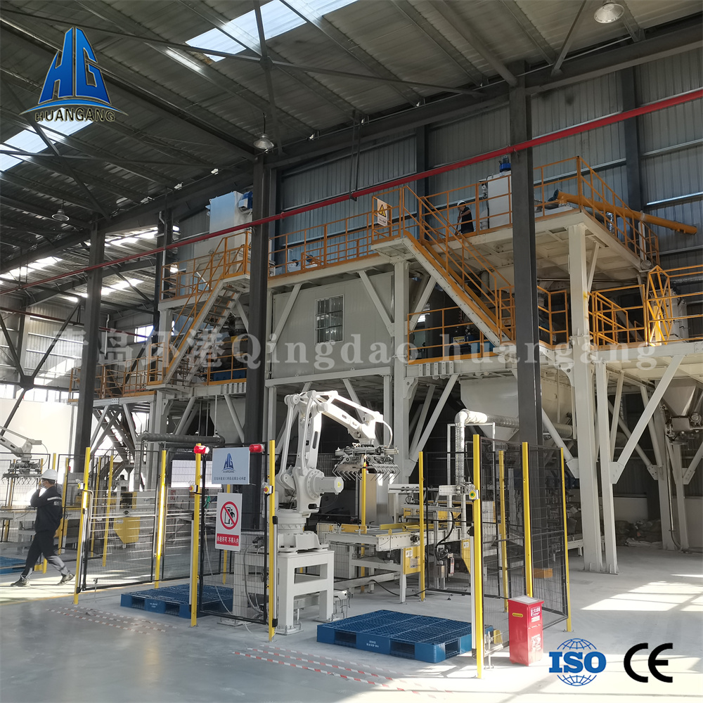 這是一套年產(chǎn)10-50萬(wàn)噸的全自動(dòng)環(huán)保節(jié)能型石膏砂漿成套設(shè)備。通過調(diào)配原料的比例不同可生產(chǎn)多種類型的石膏產(chǎn)品,例如輕質(zhì)石膏、重質(zhì)石膏。每小時(shí)根據(jù)混合機(jī)所選型號(hào)不同、配置不同、可生產(chǎn)10~50噸石膏產(chǎn)品,生產(chǎn)線主樓采用塔式結(jié)構(gòu),粉料倉(cāng)安裝在主樓頂部,外加劑系統(tǒng)采用獨(dú)立平臺(tái)計(jì)量泵送。骨料自上而下經(jīng)過計(jì)量層、混合機(jī)層、成品倉(cāng)、散裝機(jī)/包裝機(jī)、碼垛設(shè)備。根據(jù)石膏粉的配方要求,可通過電腦計(jì)量精確配料后,經(jīng)過混合主機(jī)均勻攪拌,生產(chǎn)出需要的石膏產(chǎn)品,再通過智能包裝機(jī)進(jìn)行分包包裝,全自動(dòng)碼垛線進(jìn)行智能碼垛,整個(gè)過程方便、快捷又安全,能滿足多種操作需求。