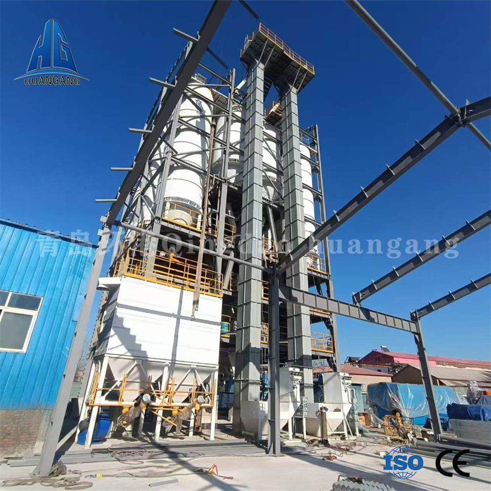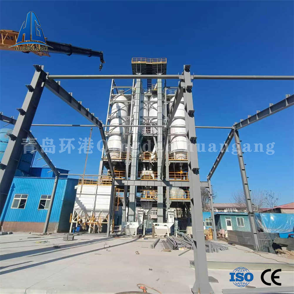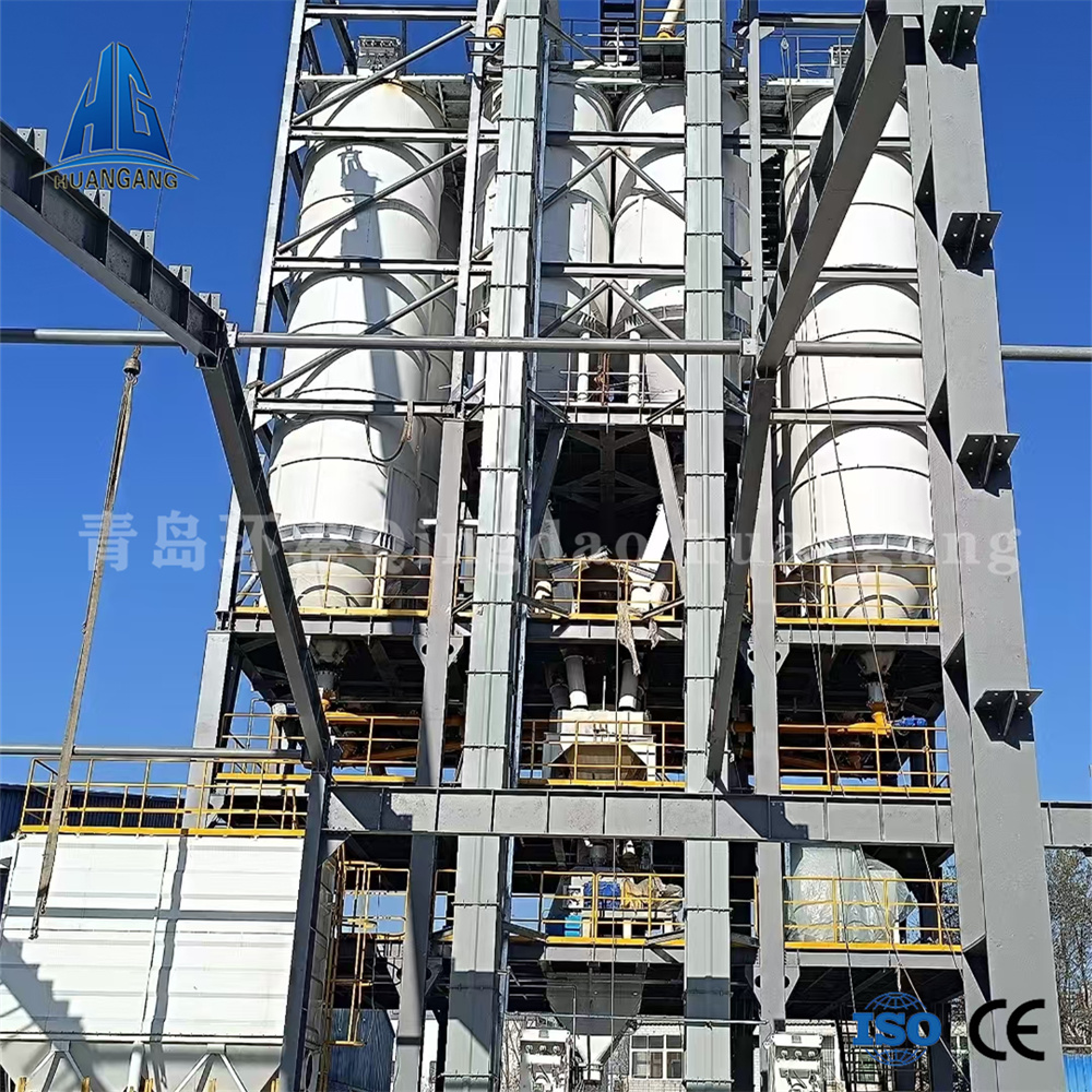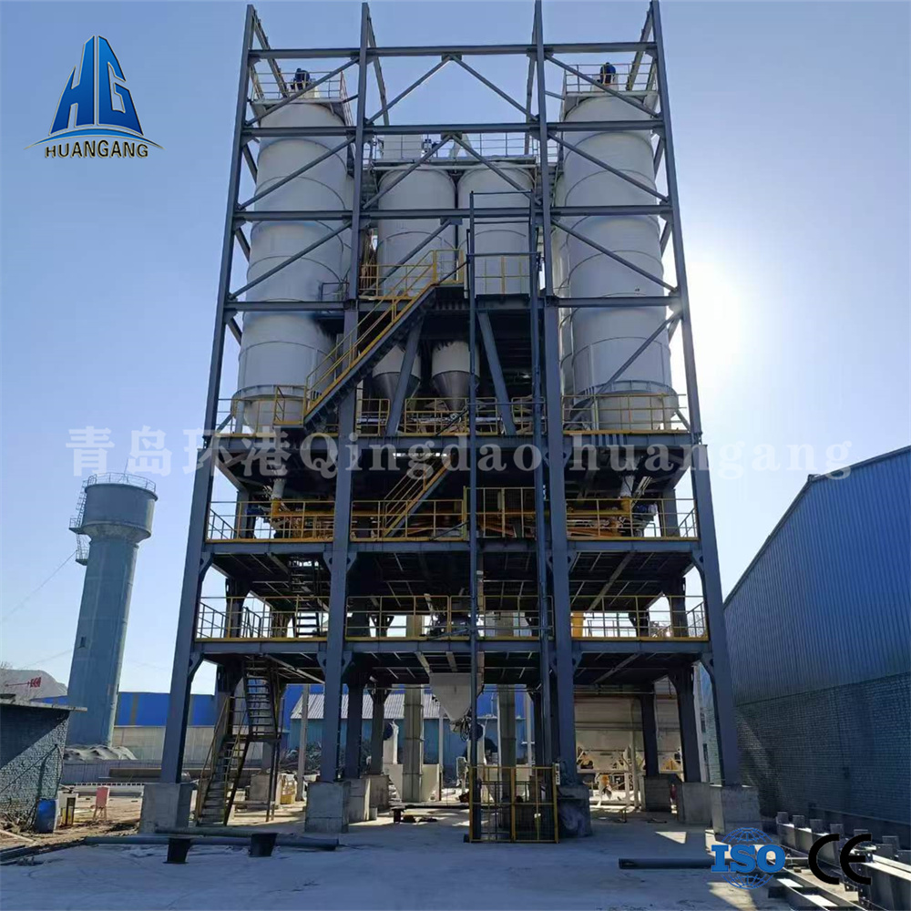 年產(chǎn)兩萬噸左右的砂漿生產(chǎn)線,一般情況下會用到3-6個原料罐,其中兩個大罐用于裝放散裝水泥和粉煤灰,其余小罐用于裝放輕鈣、重鈣、砂等。散裝水泥和粉煤灰進(jìn)罐不需要提升設(shè)備,依靠泵車打入。散裝粉煤灰倉一般為圓筒支架結(jié)構(gòu),其上部有除塵設(shè)備,防止粉塵泄漏,下部裝有破拱裝置,防止粉料結(jié)塊,使粉料卸出順暢,并裝有料位傳感設(shè)備,可隨時掌握倉內(nèi)物料使用情況。